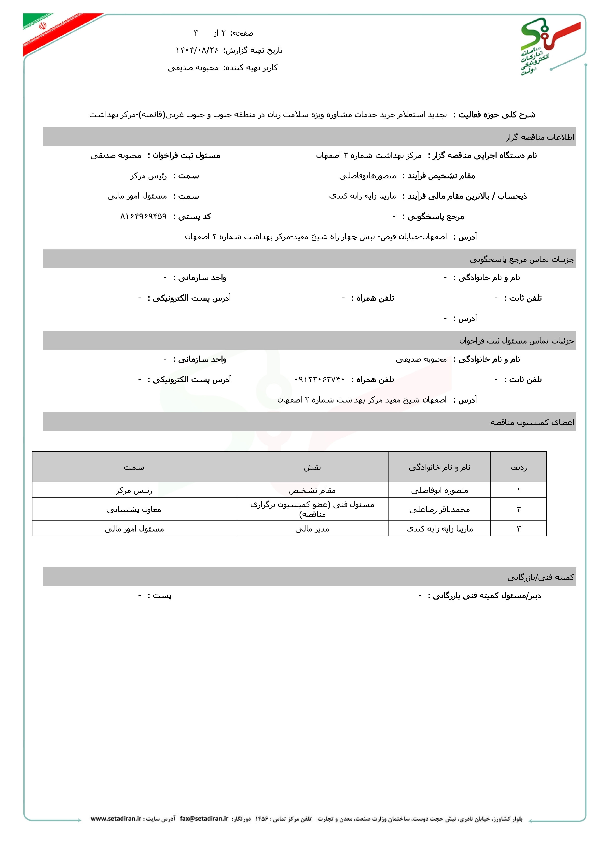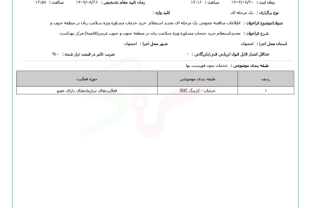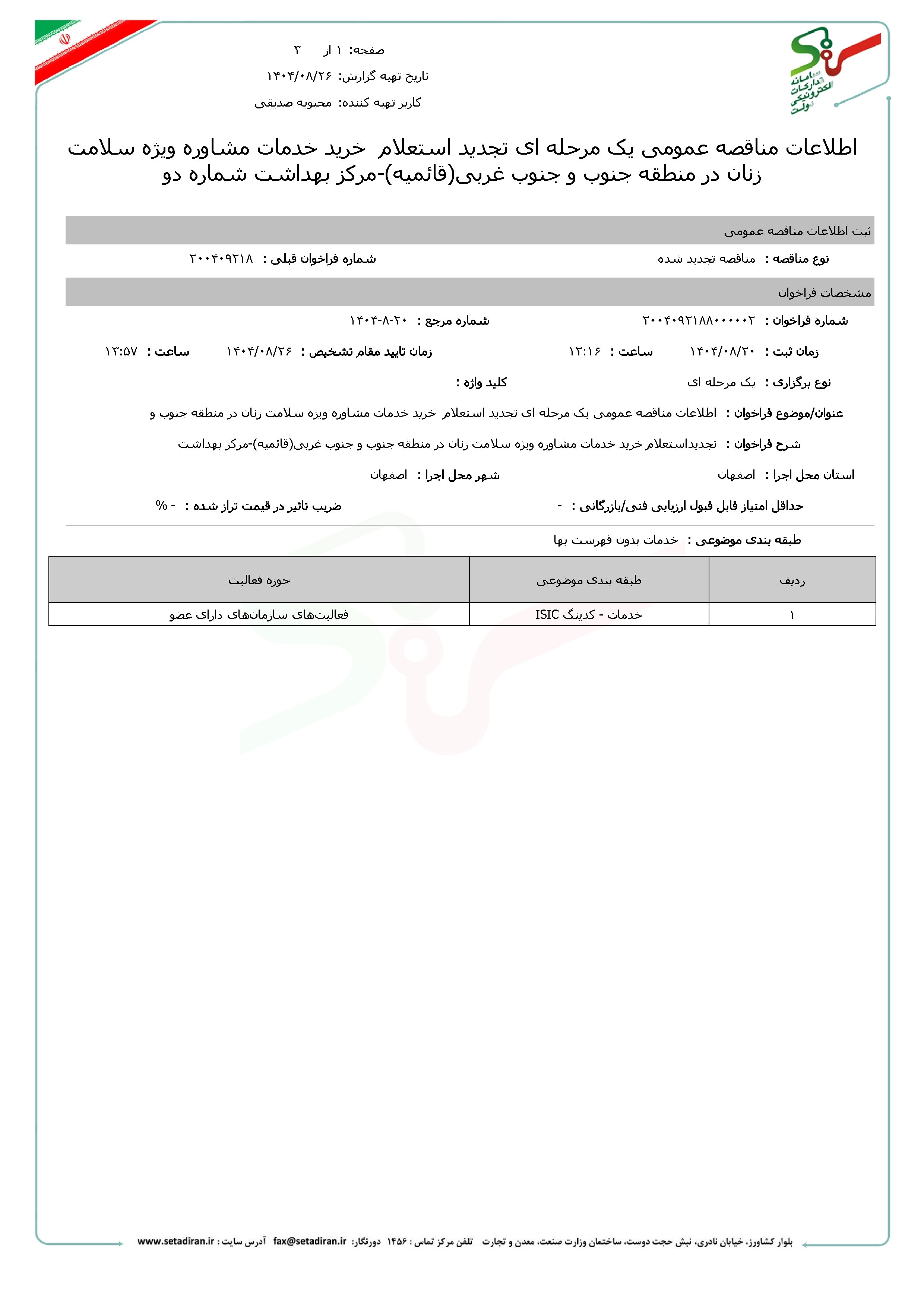 اطلاعات مناقصه عمومی یک مرحله ای تجدید استعلام خرید خدمات مشاوره ویژه سلامت زنان در منطقه جنوب و جنوب غربی(قائمیه)-مرکز بهداشت شماره دو اطلاعات مناقصه عمومی یک مرحله ای تجدید استعلام خرید خدمات مشاوره ویژه سلامت زنان در منطقه جنوب و جنوب غربی(قائمیه)-مرکز بهداشت شماره دو